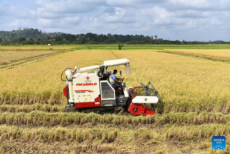 | Seorang pesawah memandu jentera penuai, menuai padi di kawasan hidro pertanian Guiguido di Divo, Cote d'Ivoire, 8 Januari 2024. (Xinhua/Han Xu) |