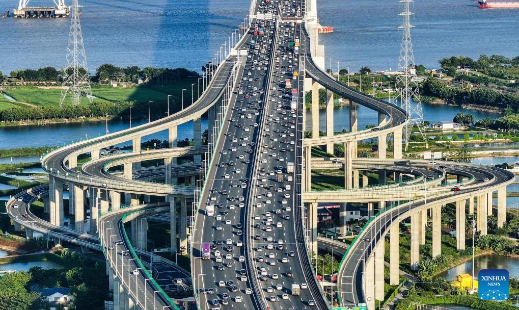 | Foto dron bertarikh 2 Oktober 2024 ini menunjukkan sebuah persimpangan bertingkat di Jambatan Nansha yang menghubungkan bandar Guangzhou dengan bandar Dongguan, di Pulau Haiou di kawasan muara Sungai Mutiara, provinsi Guangdong, selatan China. (Xinhua/Liu Dawei) |