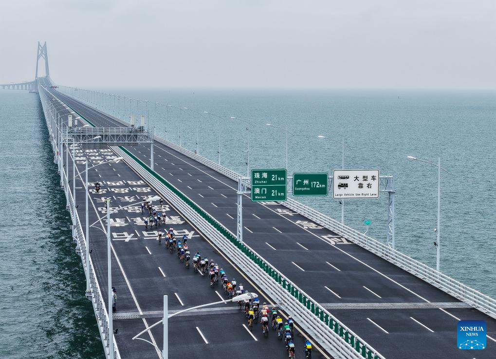 | Foto dron bertarikh 24 November 2024 ini menunjukkan perlumbaan basikal melalui Jambatan Hong Kong-Zhuhai-Makau di selatan China. (Xinhua/Liu Dawei) |