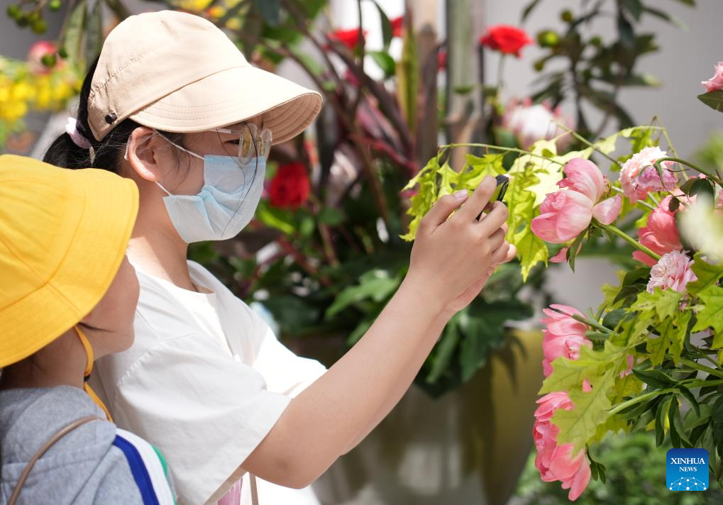 Seorang kanak-kanak mengambil gambar bunga mawar China di Simposium Antarabangsa mengenai Penyelidikan dan Penanaman Bunga Mawar edisi ke-9 di daerah Mentougou, Beijing, 11 Mei 2025. (Xinhua/Zhang Chenlin)
