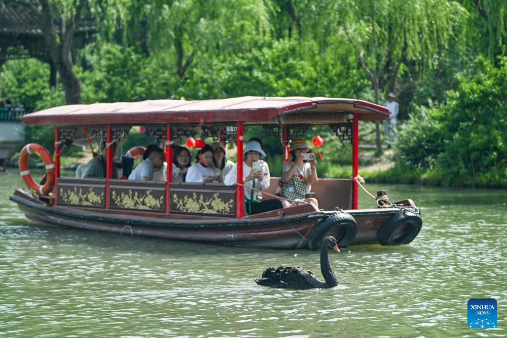 | Pelancong menaiki bot untuk melihat Tasik Barat Slender di Yangzhou, Provinsi Jiangsu, timur China pada 19 Mei 2025. (Xinhua/Chen Shuo) |