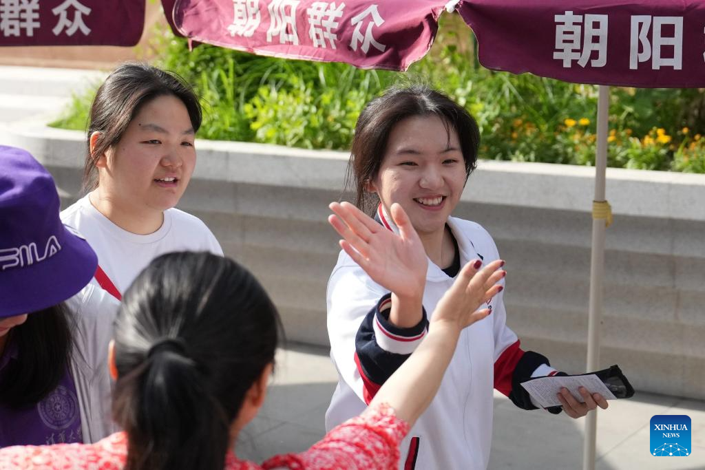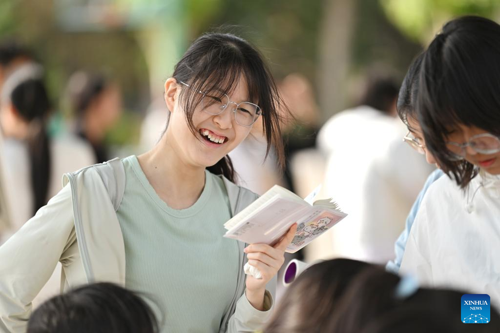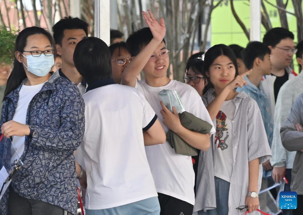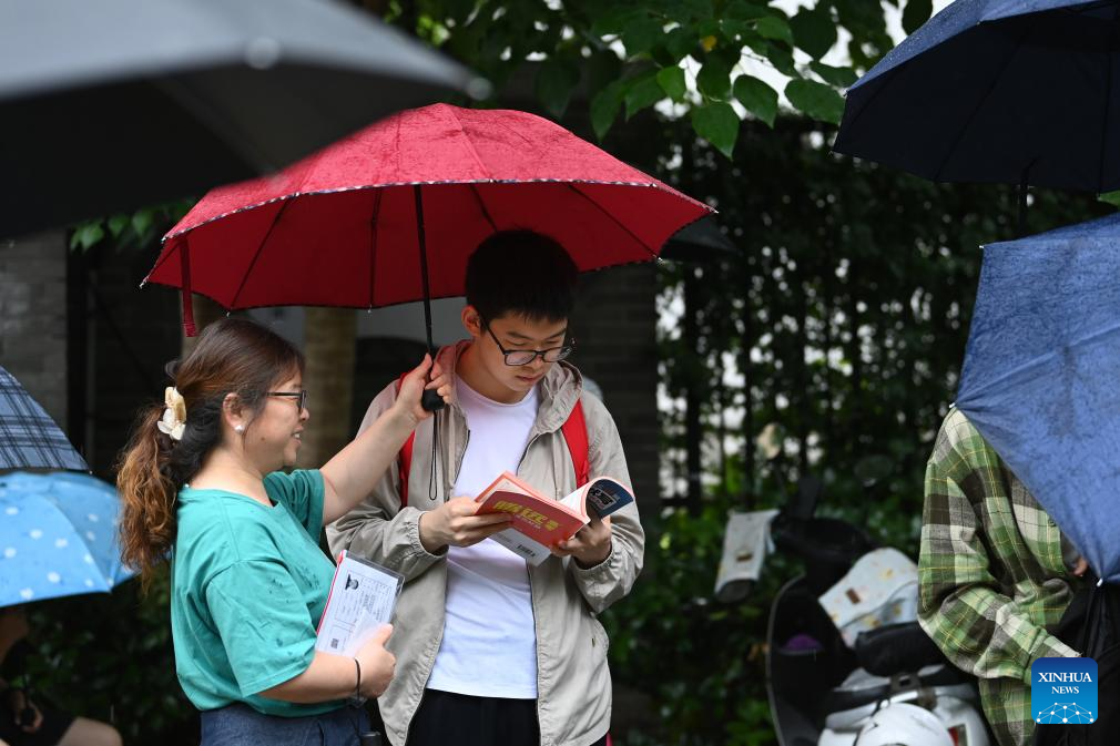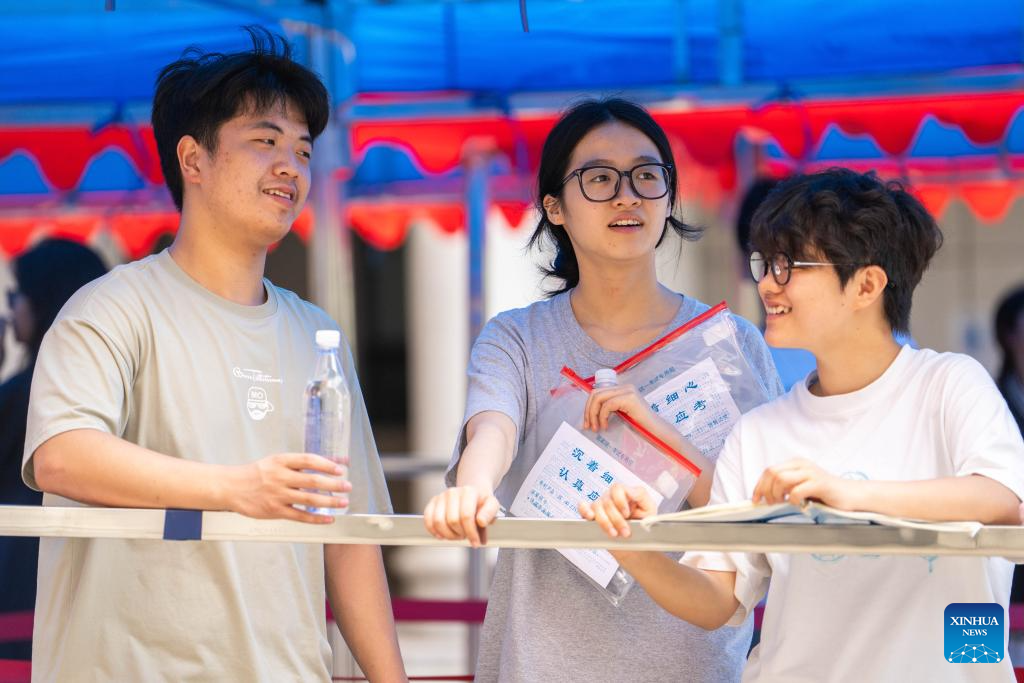 | Pelajar berkomunikasi antara satu sama lain di luar tempat peperiksaan kemasukan universiti kebangsaan di Changhsa, Provinsi Hunan pada 7 Jun 2025. (Xinhua/Chen Sihan) |