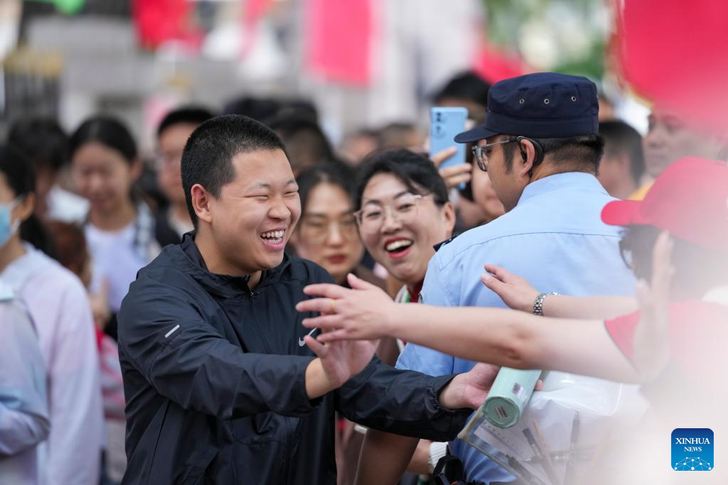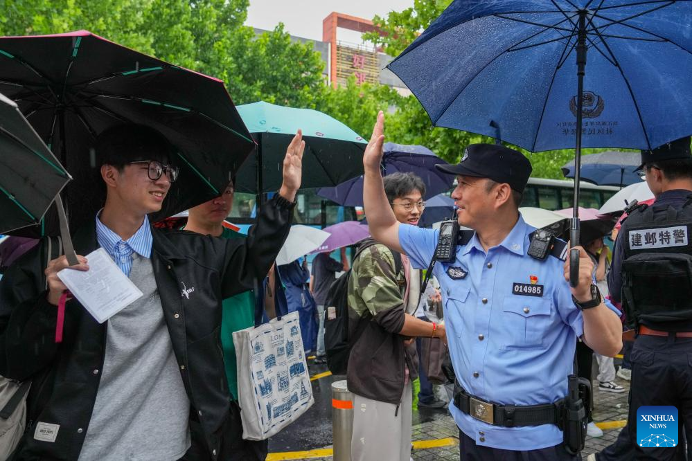 | Seorang pegawai polis memberikan tepuk ria kepada seorang pelajar di luar tempat peperiksaan kemasukan universiti kebangsaan di Nanjing, Provinsi Jiangsu pada 7 Jun 2025. (Xinhua/Li Bo) |