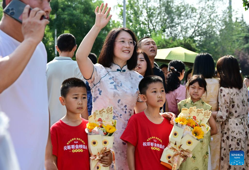 | Seorang ibu bersama-sama anak kembarnya melambai ke arah anak sulungnya yang memasuki tempat peperiksaan kemasukan universiti kebangsaan di Qingdao, Provinsi Shandong di timur China pada 7 Jun 2025. (Xinhua/Li Ziheng) |