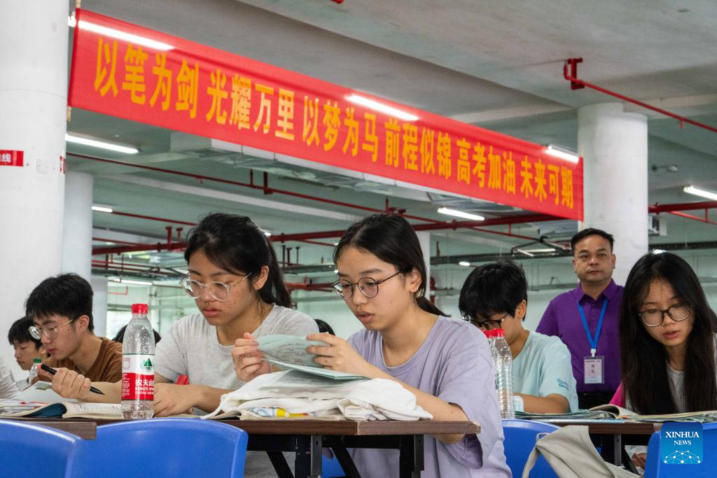 | Para pelajar bersedia untuk peperiksaan di sebuah kawasan rehat di tempat peperiksaan kemasukan universiti kebangsaan di Changsha, Provinsi Hunan, pada 7 Jun 2025. (Xinhua/Chen Sihan) |