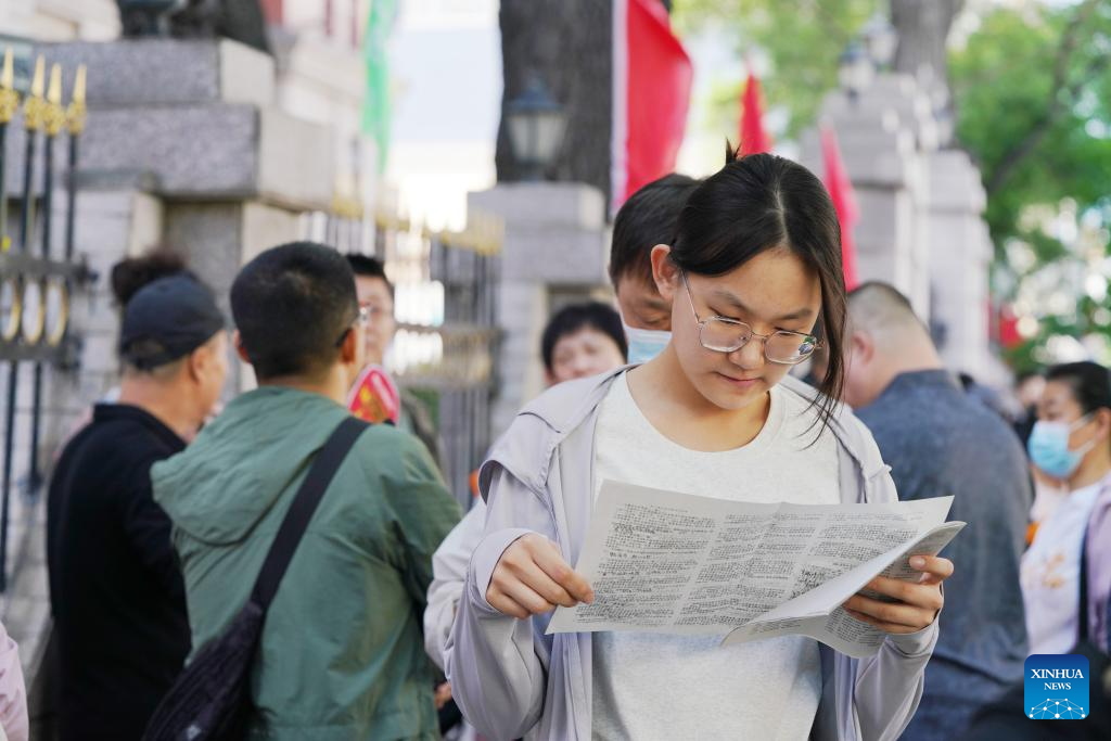 | Seorang pelajar bersedia untuk menghadapi peperiksaan di bahagian luar tempat peperiksaan di Harbin, Provinsi Heilongjiang China pada 7 Jun 2025. (Xinhua/Wang Song) |