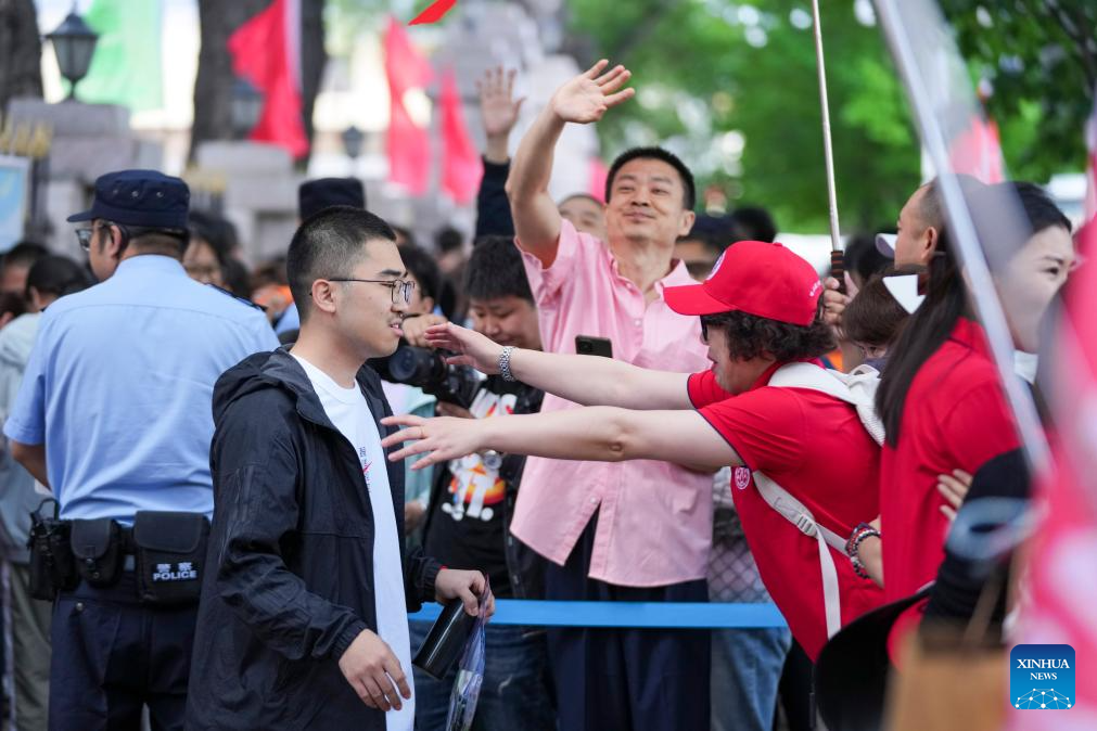 | Guru melakukan laga penumbuk dengan pelajar di luar tempat peperiksaan kemasukan universiti kebangsaan di Changsha, Provinsi Hunan di tengah China pada 7 Jun 2025. (Xinhua/Chen Zhenhai) |