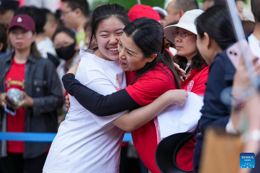 | Seorang pelajar bertepuk tangan dengan gurunya di luar tempat peperiksaan kemasukan universiti kebangsaan di Beijing, China pada 7 Jun 2025. (Xinhua/Ju Huanzhong) |