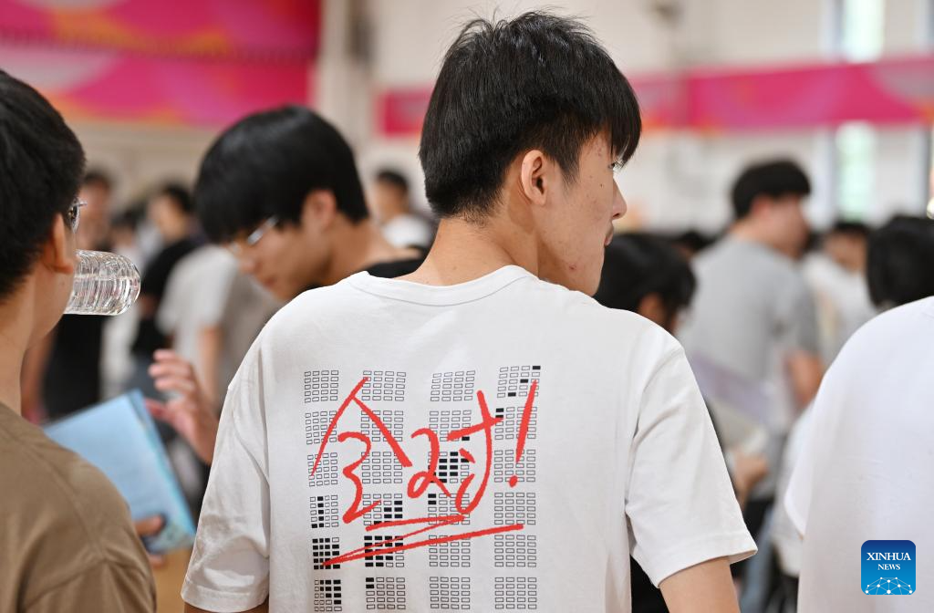 | Seorang pelajar memakai baju-T bertulis “betul semua” ketika menunggu untuk memasuki tempat peperiksaan kemasukan universiti kebangsaan di Tianjin, utara China pada 7 Jun 2025. (Xinhua/Li Ran) |