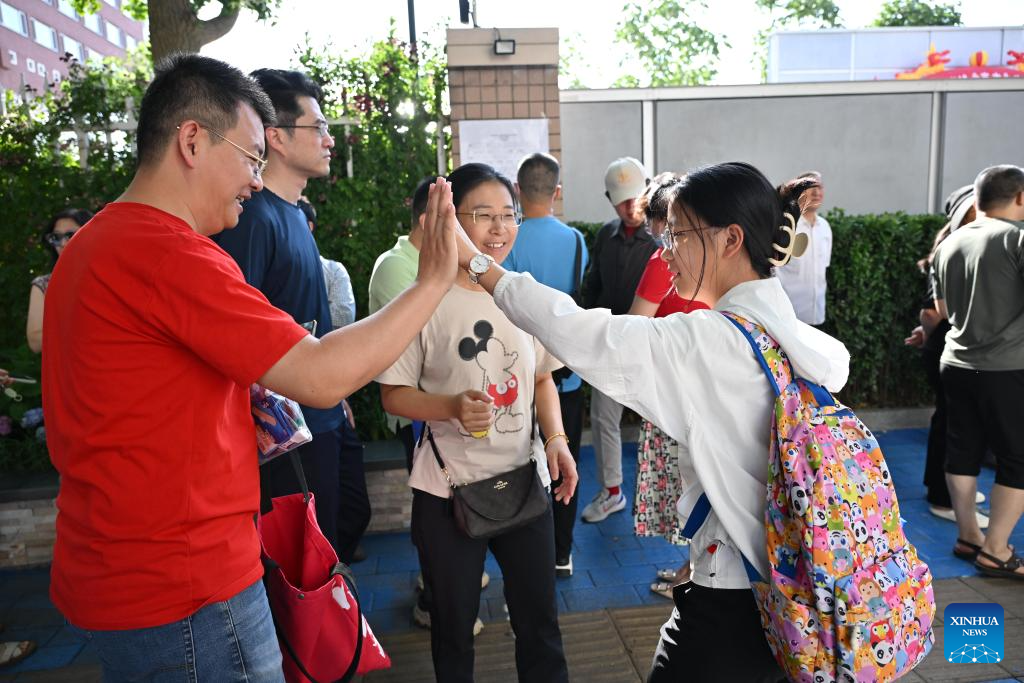 | Seorang pelajar memberikan tepuk ria kepada bapanya sebelum berjalan memasuki tempat peperiksaan kemasukan universiti kebangsaan di Beijing, ibu kota China pada 7 Jun 2025. (Xinhua/Li Xin) |