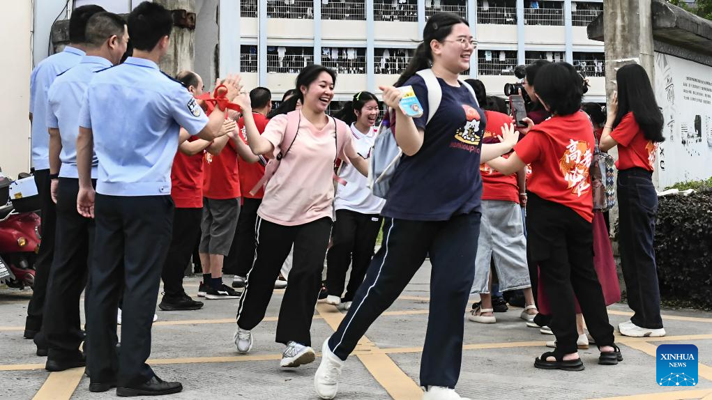 | Polis dan guru-guru memberikan sorakan buat pelajar di luar tempat peperiksaan kemasukan universiti kebangsaan di Kaunti Autonomi Dong Sanjiang, di Wilayah Autonomi Zhuang Guangxi pada 7 Jun 2025. (Xinhua/Zhang Ailin) |