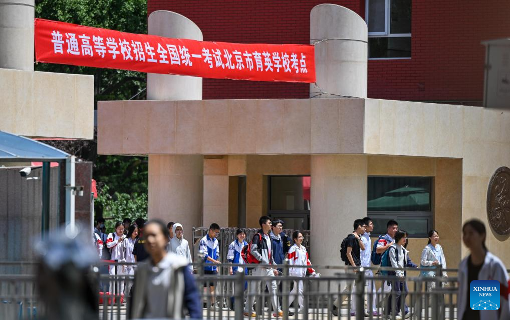 | Pelajar berjalan masuk ke dalam tempat peperiksaan kemasukan universiti kebangsaan di Beijing, ibu kota China pada 7 Jun 2025. (Xinhua/Gao Jie) |