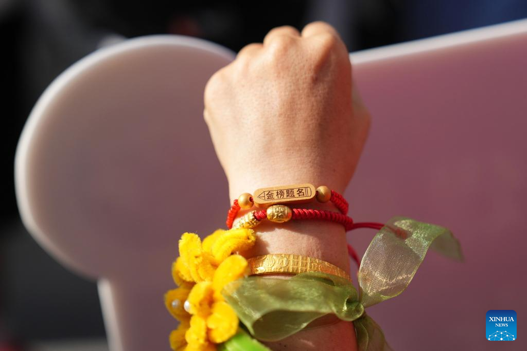 | Seorang guru memakai gelang bertulis ‘dapatkan markah tinggi dalam di luar tempat peperiksaan kemasukan universiti kebangsaan di Beijing, China pada 7 Jun 2025. (Xinhua/Ju Huanzhong) |
