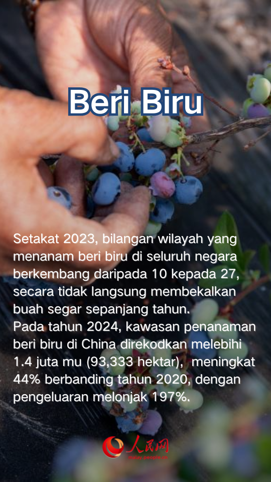 Pada tahun 2024, kawasan penanaman beri biru di China direkodkan melebihi 1.4 juta mu (93,333 hektar), meningkat 44% berbanding tahun 2020, dengan pengeluaran melonjak 197%.