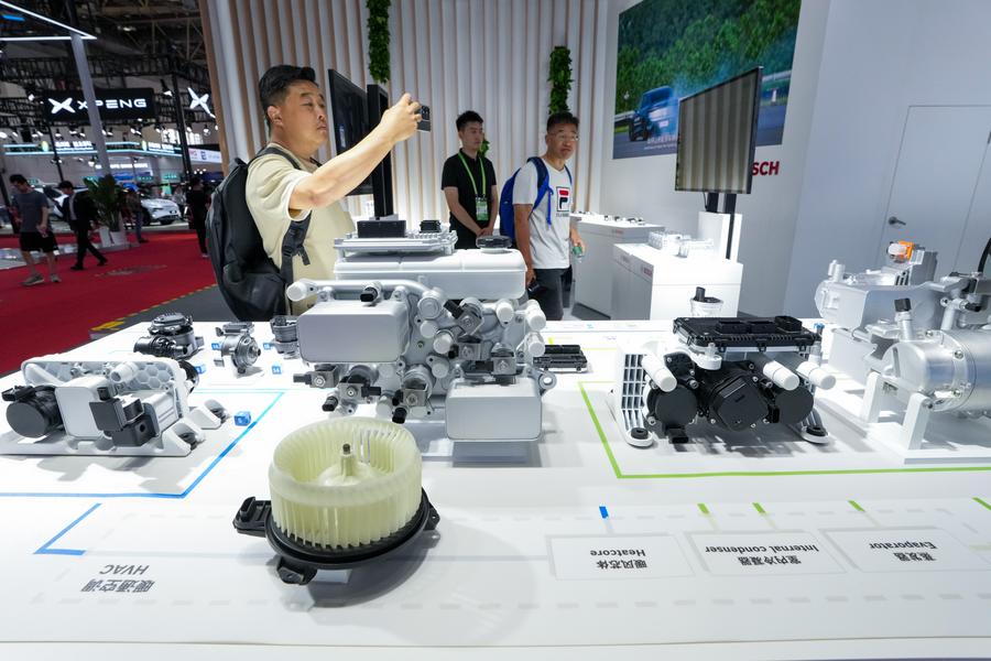 | Orang ramai mendalami tentang solusi sistem pengurusan terma di reruai milik Borsch di ruang Rantai Kenderaan Pintar di CISCE ke-3 di Beijing, ibu kota China pada 19 Julai 2025. (Xinhua/Ju Huanzong) |