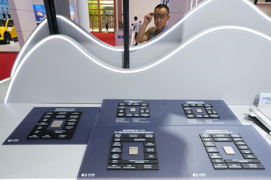 | Seorang pelawat melihat cip untuk sistem bantuan pemandu di reruai Black Sesame Technologies di ruang Rantai Kenderaan Pintar di CISCE ke-3 di Beijing, ibu kota China pada 19 Julai 2025. (Xinhua/Ju Huanzong) |