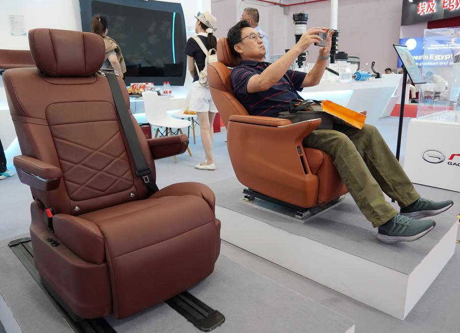 | Seorang pelawat mencuba kerusi kereta ergonomik tanpa tekanan di ruang Rantai Kenderaan Pintar di CISCE ke-3 di Beijing, ibu kota China pada 18 Julai 2025. (Xinhua/Zhang Chenlin) |