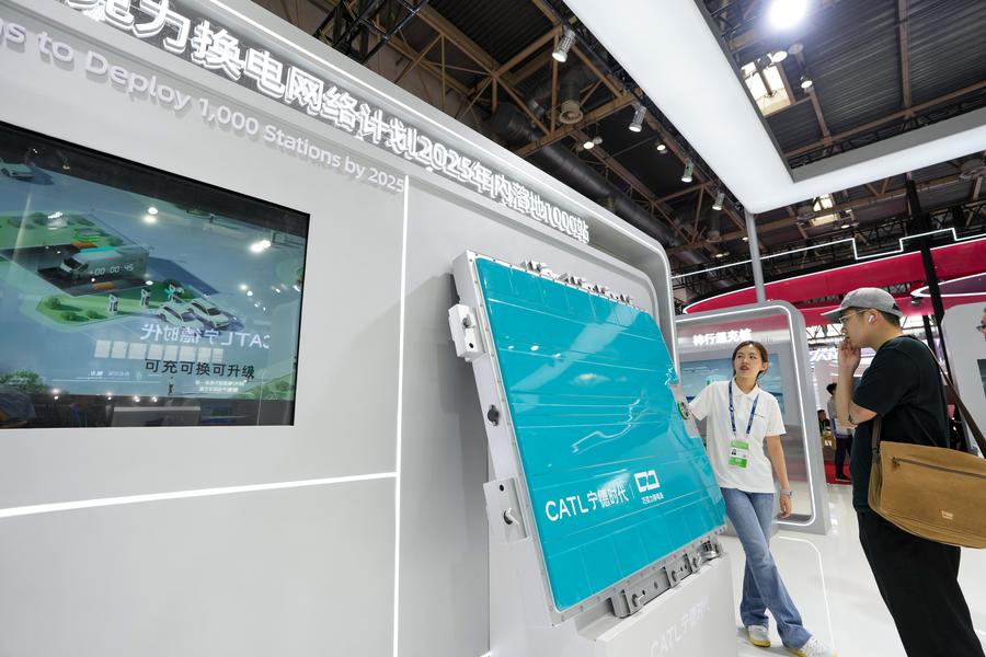 | Pengecas ultra pantas Shenxing boleh dilihat di reruai milik Contemporary Amperex Technology (CATL) di ruang Rantai Kenderaan Pintar di CISCE ke-3 di Beijing, ibu kota China pada 18 Julai 2025. (Xinhua/Zhang Chenlin) |