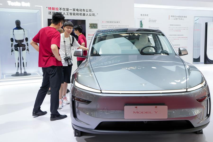 | Pelawat mendekati Model Y milik gergasi AS, Tesla di ruang Rantai Kenderaan Pintar di CISCE ke-3 di Beijing, ibu kota China pada 19 Julai 2025. (Xinhua/Ju Huanzong) |