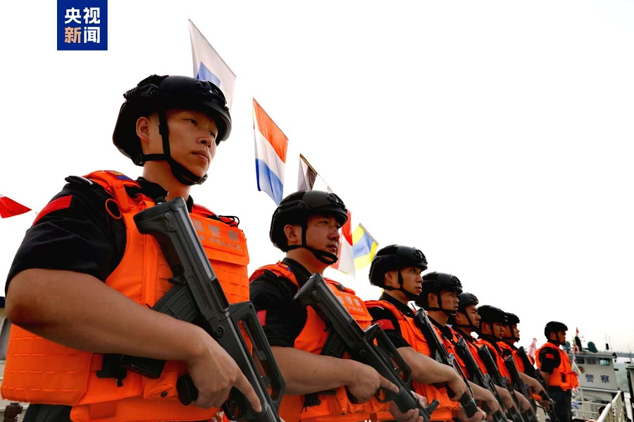 Tiga kapal penguat kuasa undang-undang milik China berlepas dari dermaga Jingha di Xishuangbanna, provinsi Yunnan menuju ke perairan yang ditetapkan untuk menyertai misi rondaan bersama tiga negara lain.