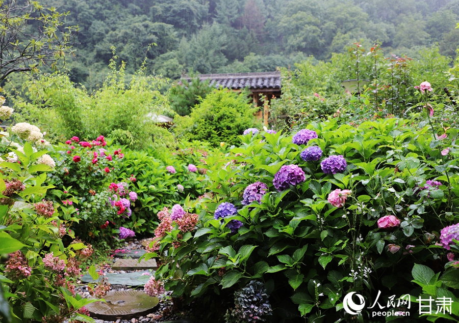 | Foto memaparkan bunga berkembang mekar di halaman sebuah B&B di kampung Liziba, Perbandaran Tibet Tielou di kaunti Wenxian, bandar Longnan, Provinsi Gansu di barat laut China. (People’s Daily Online/Shao Lan) |