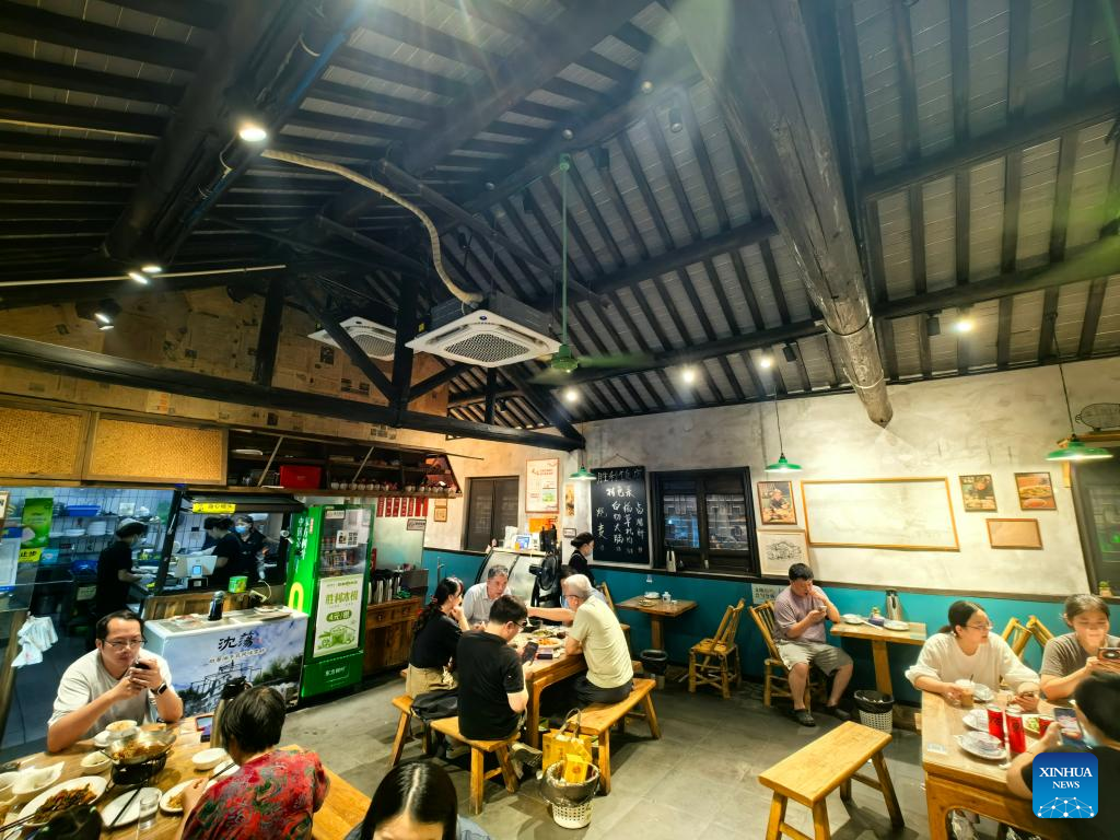 | Orang ramai menikmati hidangan malam sebuah restoran yang disebut di dalam sebuah novel karya Yu Hua, iaitu penulis kontemporari China yang terkenal, di Pekan Shendang, Bandar Jiaxing, Provinsi Zhejiang, di timur China pada 19 September 2025. (Xinhua/Xu Yu) |