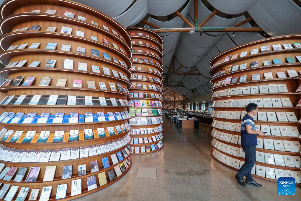 | Foto sebuah kedai buku yang diubahsuai daripada bangsal di taman industri kebudayaan di Pekan Shendang, Bandar Jiaxing, Provinsi Zhejiang, di timur China pada 19 September 2025. (Xinhua/Xu Yu) |
