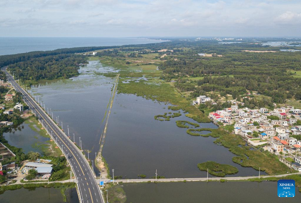 | Foto sudut udara ini memaparkan Taman Tanah Lembap Negara Haiwei di Kaunti Autonomi Li Changjiang di Provini Hainan, selatan China, pada 4 Oktober 2025. (Xinhua/Pu Xiaoxu) |