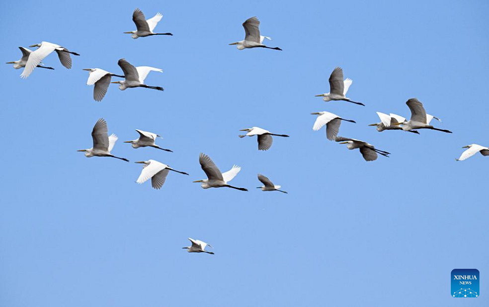 | Bangau berterbangan di Taman Tanah Lembap Negara Haiwei di Kaunti Autonomi Li Changjiang di Provini Hainan, selatan China, pada 2 Oktober 2025. (Xinhua/Pu Xiaoxu) |