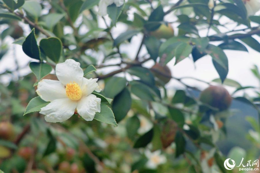 | Foto mempamerkan bunga camellia teh minyak putih yang bermekaran di kaunti Yingtai, bandar Fuzhou, Provinsi Fujian di tenggara China. (People’s Daily Online/Lin Mingxian) |