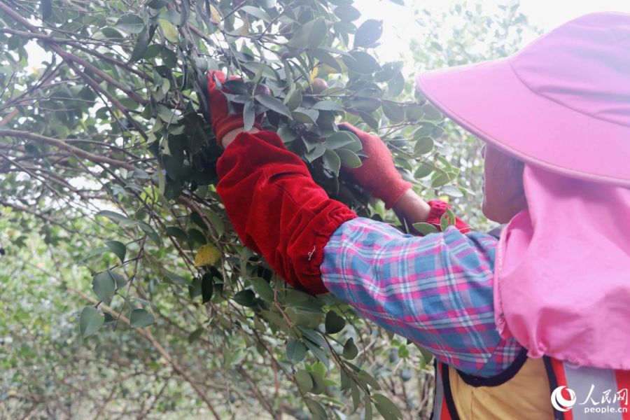 | Seorang petani memetik buah teh minyak camellia yang sudah masak di kaunti Yongtai, bandar Fuzhou, Provinsi Fujian di tenggara China. (People’s Daily Online/Lin Mingxian) |