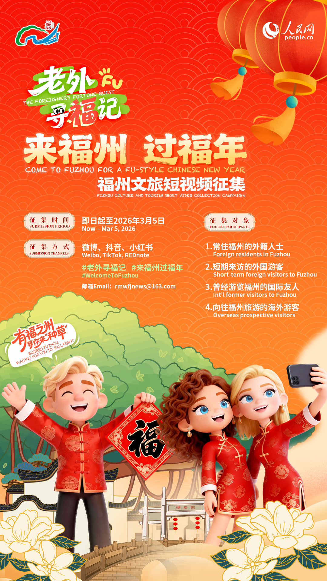 Mulai sekarang hingga 5 Mac 2026, Biro Budaya dan Pelancongan Bandar Fuzhou melalui kolaborasi dengan People’s Daily Online menganjurkan pertandingan video pendek “Datang ke Fuzhou, Sambut Tahun Baharu Bertuah”, dan dengan penuh mesra mengundang sahabat-sahabat dari seluruh dunia yang mempunyai pertalian dengan Fuzhou.