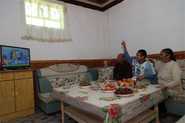 Abduhalik Hemdulla menonton Piala Dunia FIFA 2022 bersama ibu bapanya. (People’s Daily Online/ihsan jabatan publisiti jawatankuasa wilayah Kashgar Parti Komunis China)