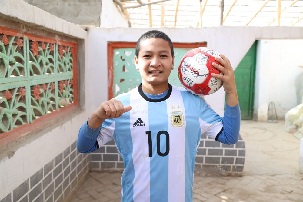 Abduhalik Hemdulla yang berusia 14 tahun menayangkan jersi dan bola sepak yang dihadiahkan oleh Lionel Messi. (People’s Daily Online/ihsan jabatan publisiti jawatankuasa wilayah Kashgar Parti Komunis China)