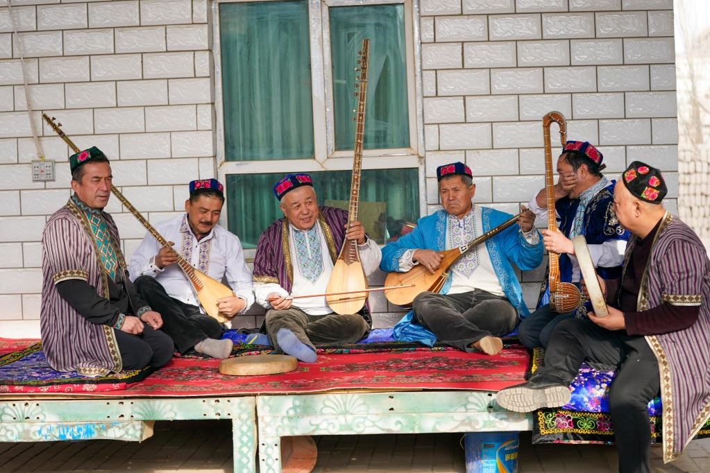 Pada 11 Januari lalu, artis Muqam, Mamat Yusup (tiga dari kiri) dan Sulayman Abdu (keempat dari kiri) membuat persembahan Muqam di majlis perkahwinan kampung. (Foto/Xinhua)