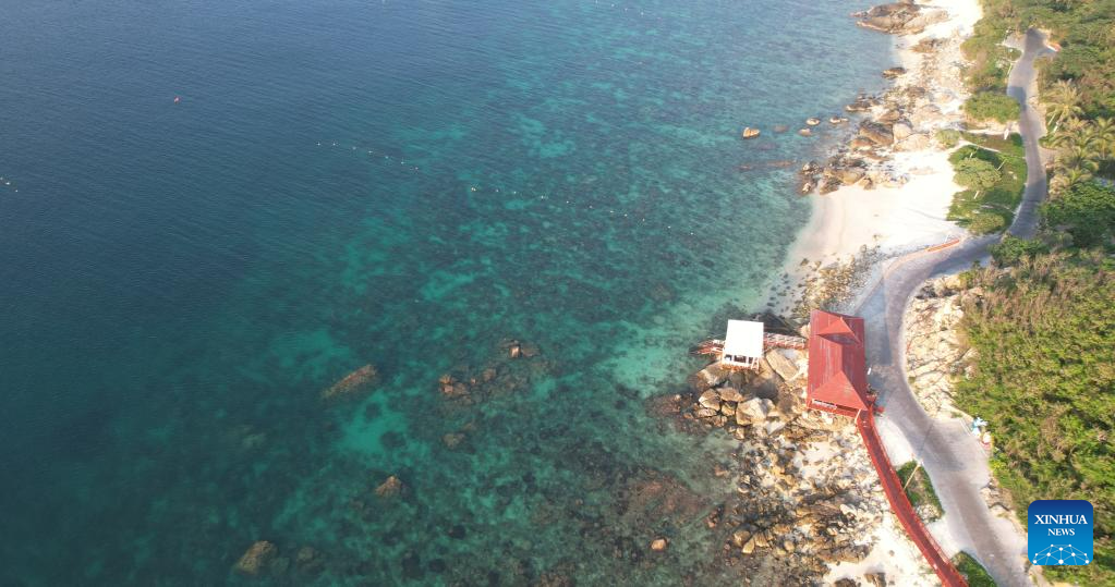 | Foto udara yang diambil pada 18 Mei 2023 ini menunjukkan sebuah ladang ternak marin di perairan Pulau Wuzhizhou di Sanya, provinsi Hainan, selatan China. (Xinhua/Fan Yuqing) |