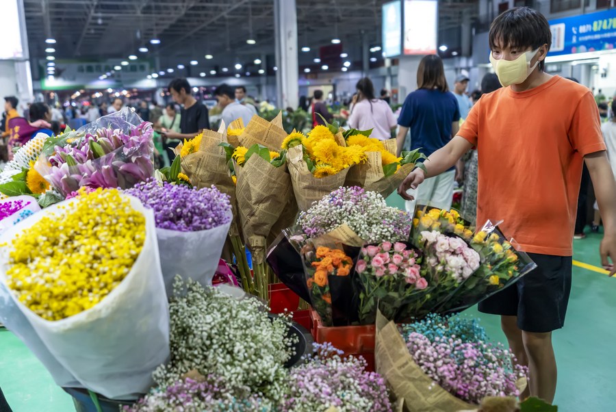 Orang ramai melawat Pasar Bunga Kunming Dounan pada waktu malam, di provinsi Yunnan, barat daya China, 12 Julai 2022. (Xinhua/Chen Xinbo)