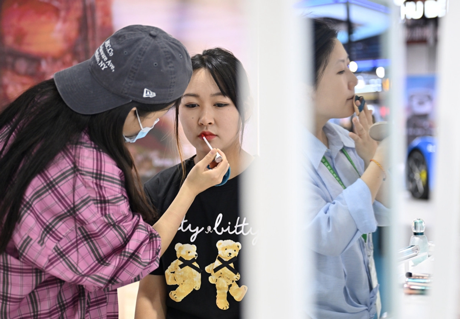 | Pengunjung mencuba produk persolekan semasa Ekspo Produk Pengguna Antarabangsa China (CICPE) di Haikou, ibu provinsi Hainan, selatan China, pada 15 April 2024. (foto/Xinhua) |