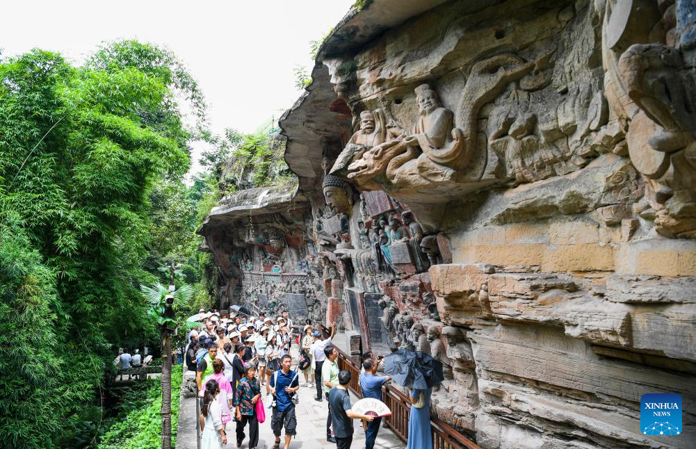 | Para pelancong melawat kawasan pemandangan Ukiran Batu Dazu di Chongqing, barat daya China, 7 Julai 2024. Tapak Ukiran Batu Dazu telah disenarai masuk dalam Senarai Warisan Dunia UNESCO pada 1999. Contoh terbaik seni gua China, iaitu tapak Ukiran Batu Dazu mempunyai kepentingan sejarah yang mendalam, menjelmakan daya hidup budaya China yang cergas. (Xinhua/Wang Quanchao) |