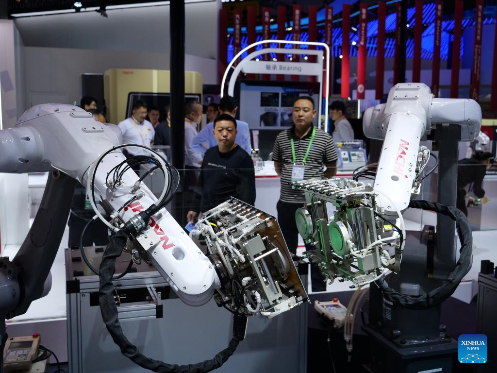| Pengunjung melihat robot di ruang pameran Nachi-Fujikoshi Corp. pada Ekspo Import Antarabangsa China (CIIE) ke-7 di Shanghai, 5 November 2024. Edisi terbaru CIIE, iaitu ekspo peringkat negara pertama di dunia yang bertemakan import, membuka tirai di Shanghai, Selasa. (Xinhua/Wang Yiliang) |