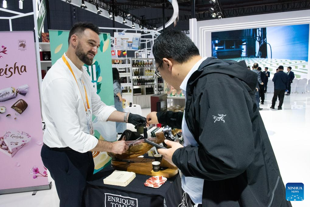 | Seorang pempamer memperkenalkan ham Sepanyol kepada pengunjung pada Ekspo Import Antarabangsa China (CIIE) ke-7 di Shanghai, 5 November 2024. Edisi terbaru CIIE, iaitu ekspo peringkat negara pertama di dunia yang bertemakan import, membuka tirai di Shanghai, Selasa. (Xinhua/Liu Qian) |