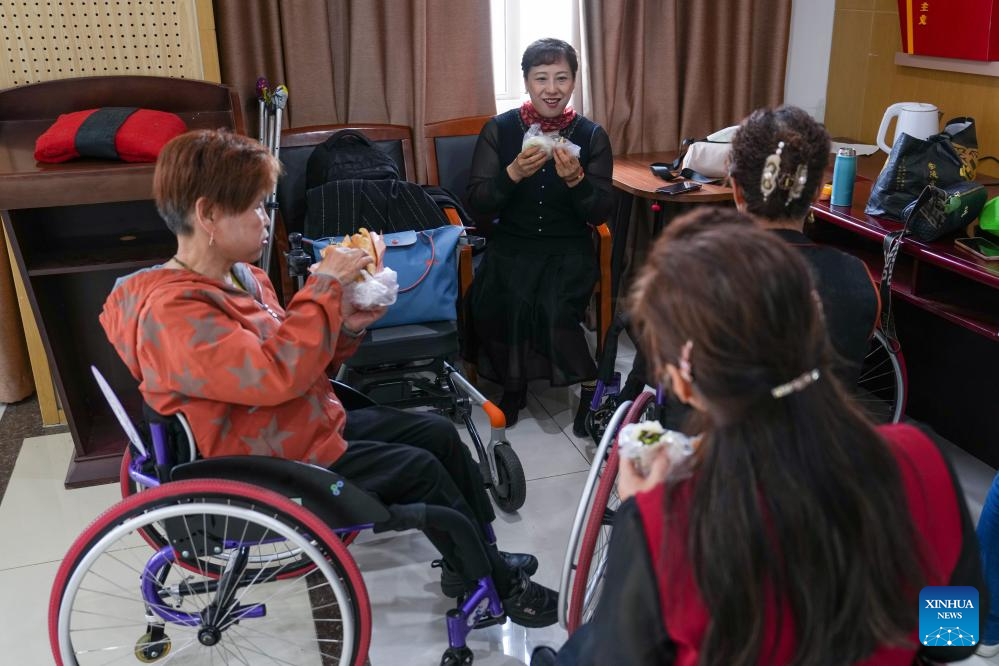 | Song Aixia (dua dari kiri) dan rakan-rakannya menjamu makan tengah hari sebelum mempersembah tarian berkerusi roda untuk komuniti penduduk di Nanjing, Provinsi Jiangsu di timur China pada 27 April 2025. (Xinhua/Li Bo) |