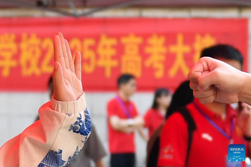 | Guru melakukan laga penumbuk dengan pelajar di luar tempat peperiksaan kemasukan universiti kebangsaan di Changsha, Provinsi Hunan di tengah China pada 7 Jun 2025. (Xinhua/Chen Zhenhai) |