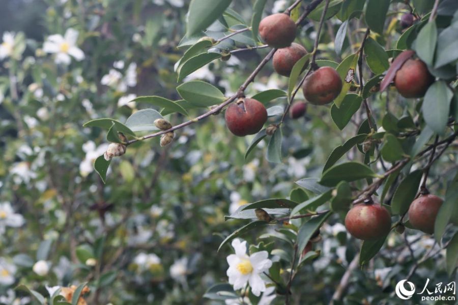 | Foto memperlihatkan teh minyak camellia berkembang dan berbuah pada pokok yang sama. (People’s Daily Online/Lin MIngxian) |