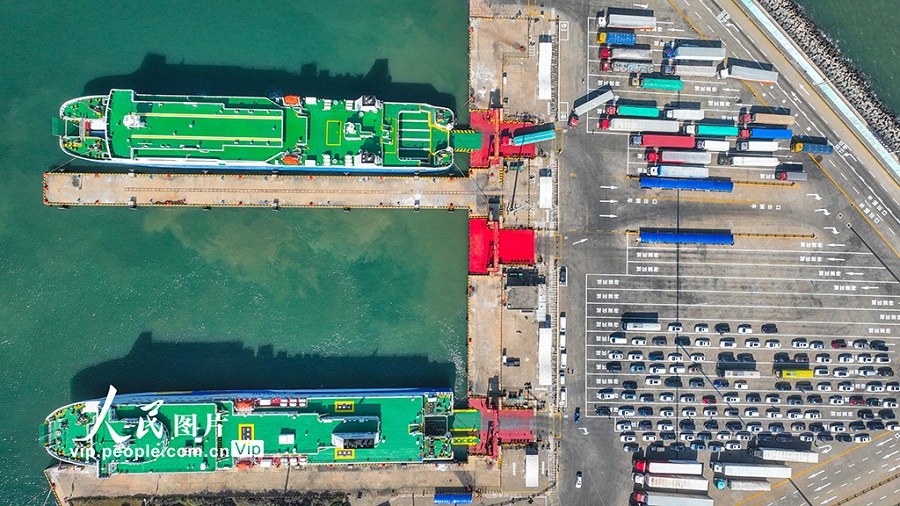 Suasana teratur dan sibuk kelihatan di sebuah pelabuhan di Haikou, ibu provinsi Hainan, apabila deretan kenderaan beratur untuk menaiki feri penumpang jenis roll-on/roll-off pada 2 Februari.
