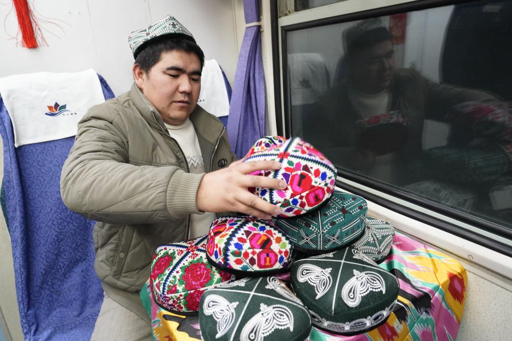 Di dalam gerabak kereta api ini, pelbagai barangan dari selatan Xinjiang dijual, termasuk kurma merah, walnut, badam, kuih bulan tradisional serta topi sulaman tangan yang mencerminkan budaya tempatan.