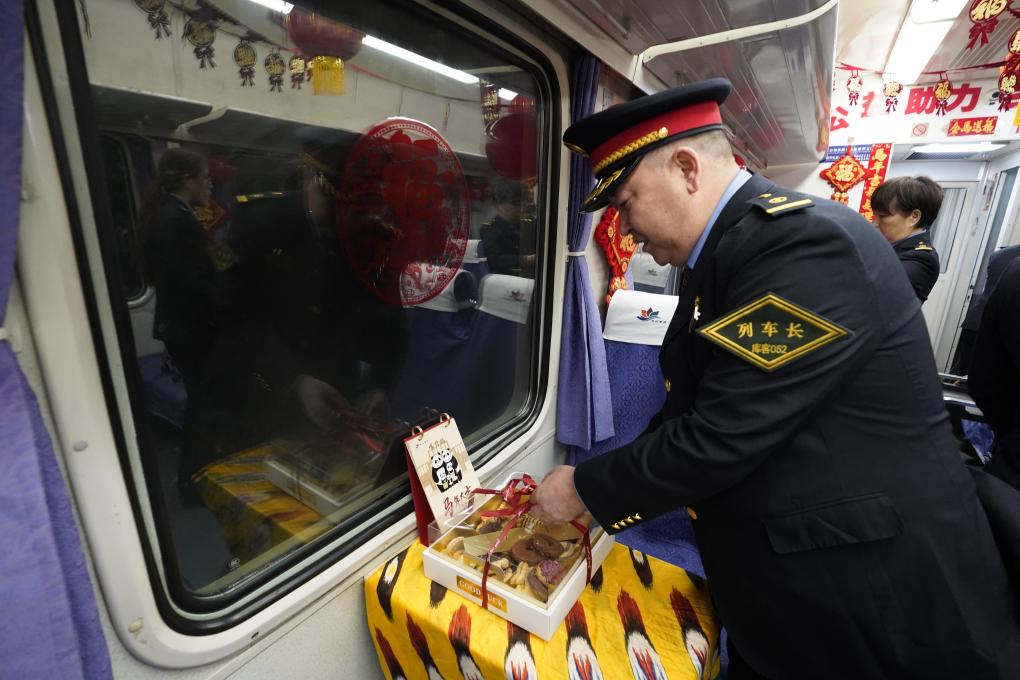 | Konduktor kereta api mengagihkan kuih perayaan kepada penumpang. (Xinhua/Bai Zhiqiang) |