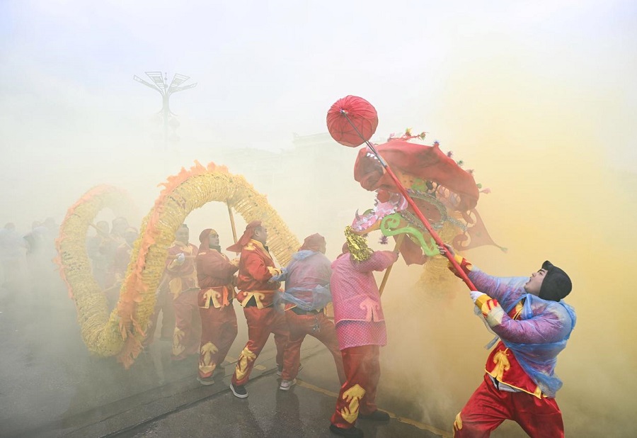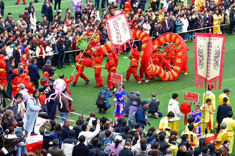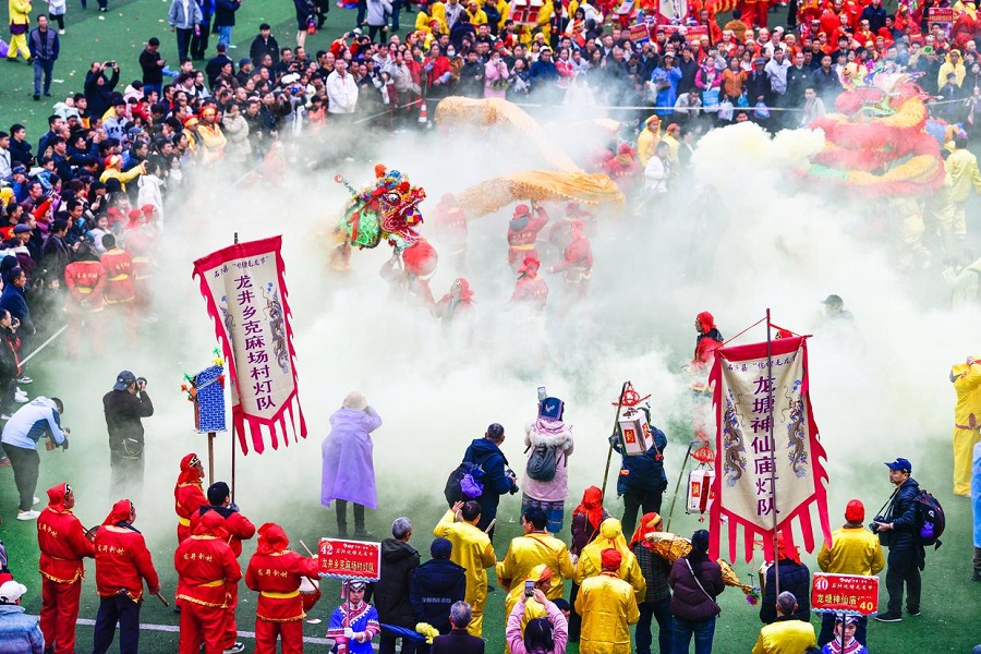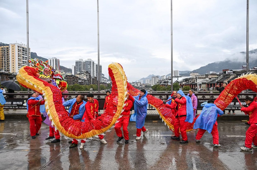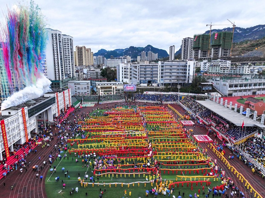 | Penduduk tempatan mempersembahkan tarian naga pada “Pesta Maolong” etnik Yilao di kaunti Shiqian, provinsi Guizhou, barat daya China, 27 Februari 2026. (Xinhua/Yang Wenbin) |