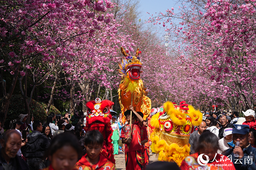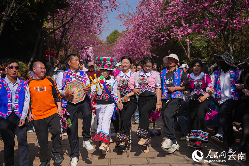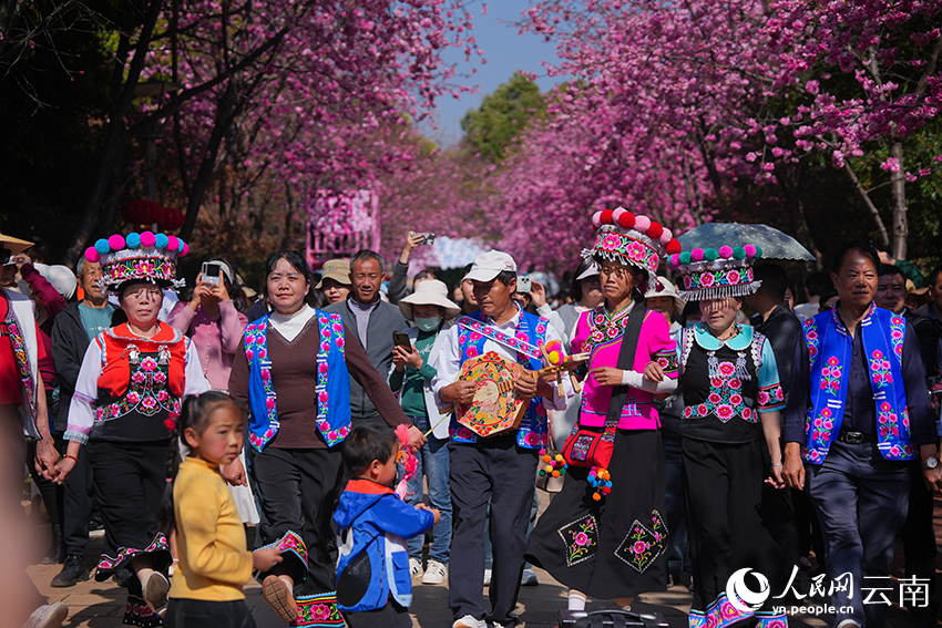 | Kumpulan persembahan rakyat berarak di tengah-tengah bunga ceri. |