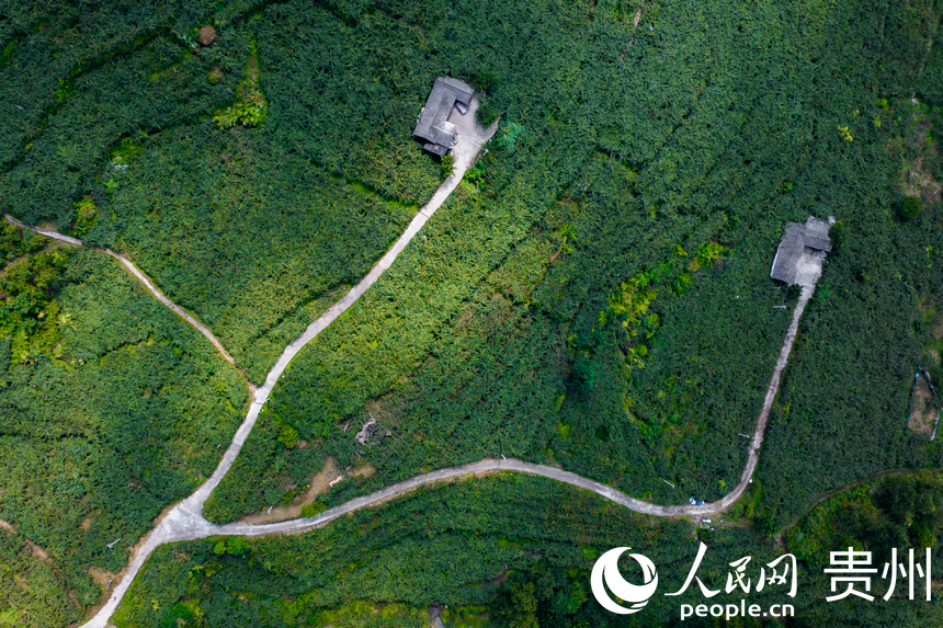 | Foto menunjukkan pemandangan sudut udara di sebuah pangkalan buah kiwi seluas 12,000 mu di kampung Pingtan, pekan Gubao, kaunti Xiuwen, Guiyang, di Provinsi Guizhou, barat daya China. (People’s Daily Online/Tu Min) |